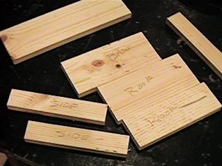 The pieces that you have cut nowThese are the three pieces that you cut that are all the same length. From the narrow board you have two 8" pieces that will be the sides. From the medium board you have one 8" piece which is one side of the roof. From the wide board you have two 8" pieces. One of these is the base and the other one is part of the roof.You still have pieces of the wide and narrow boards that you will cut pieces out of. |