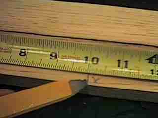 Using the wide board make a mark 10" from one end. Put an "X" on the side that you want to cut. Label the side that you want to keep.